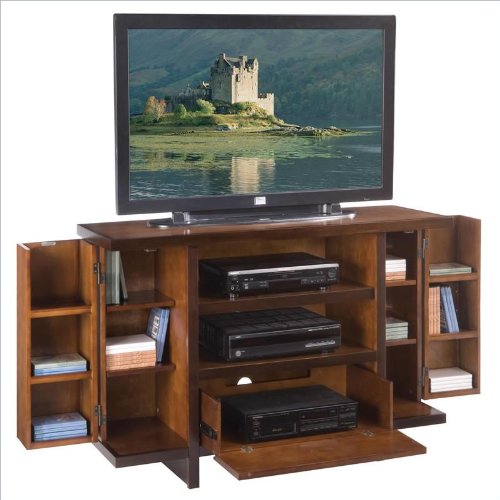 The geo deluxe entertainment center is constructed of poplar hardwood solids with walnut veneers in a rich walnut finish. Frame and top edges feature contrasting dark walnut veneer trim. Features start with a 52-inch wide top that will nicely accommodate larger flat screened TVs most 60-inch. To that add a convenient, cable accessible, open compartment with an adjustable shelf to house electronics. Or for additional or optional electronic storage use the cable accessible bottom drawer featuring a drop-front and metal drawer glides. Find ample DVD storage with the cleverly designed side cabinets that provide storage not only within the cabinet but also on the interior of the doors. Antiqued brass finished hardware. Easy to assemble. Measures 52-inch width by 18-inch depth by 32-inch height.